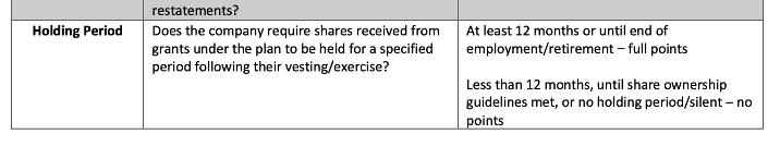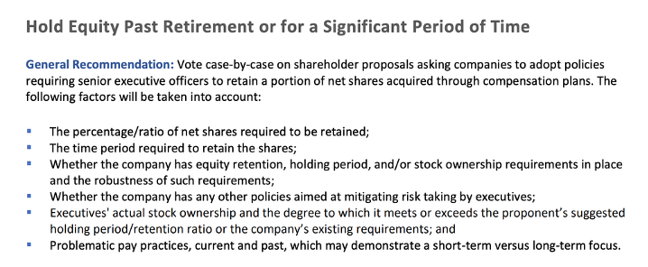 ISS's policies are also relatively qualitative in their assessment of holding periods, and the only qualitative impact comes from a minor scored factor in the Equity Plan Score Card model.