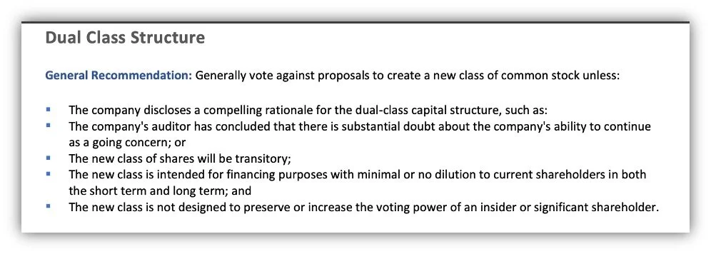There were a handful of companies with dual-class share structures that were skating by due to language loopholes. This policy change should capture all companies with multiple classes of shares (ala META or GOOG). ISS considers a dual-class structure a Problematic Governance Practice, and often leads to ISS recommending against the company when it comes to governance shareholder or management proposals.