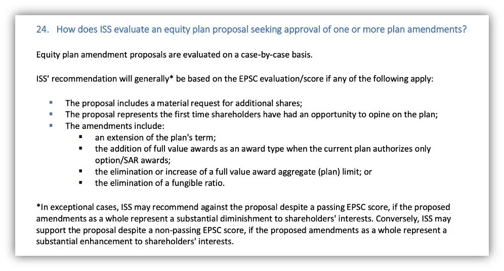 The second half of this policy change indicates that a new ‘dealbreaker’ provision will also be included in the Plan Features pillar. The term dealbreaker indicates that ISS will automatically fail the company’s equity plan if not enough points are earned in the Plan Features pillar, regardless of points achieved. I expect the updated ISS Equity Compensation Plans FAQ will outline how many points a company needs to score in the Plan Features pillar to not trigger this dealbreaker.